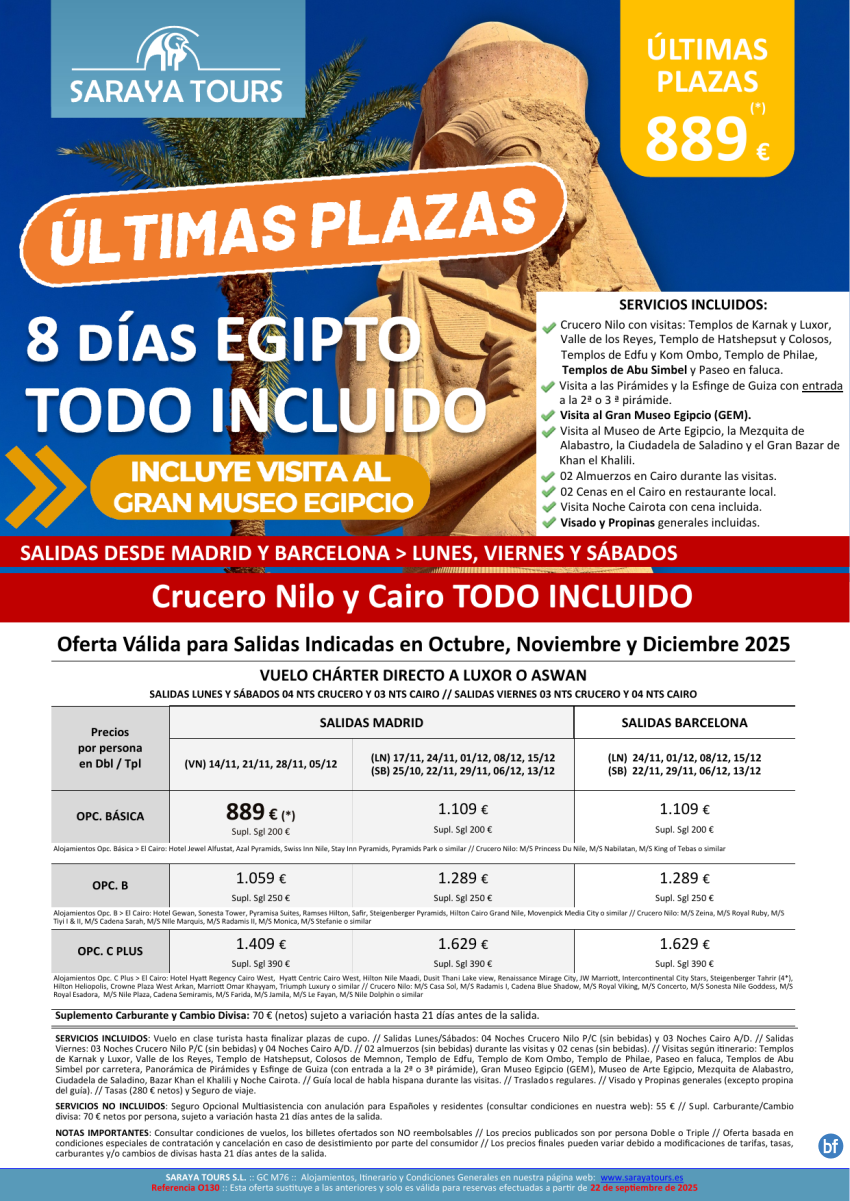 Últimas Plazas Egipto Todo Incluido dsd 889€ con Visitas Incluidas! Salidas Oct, Nov & Dic dsd Mad & Bcn