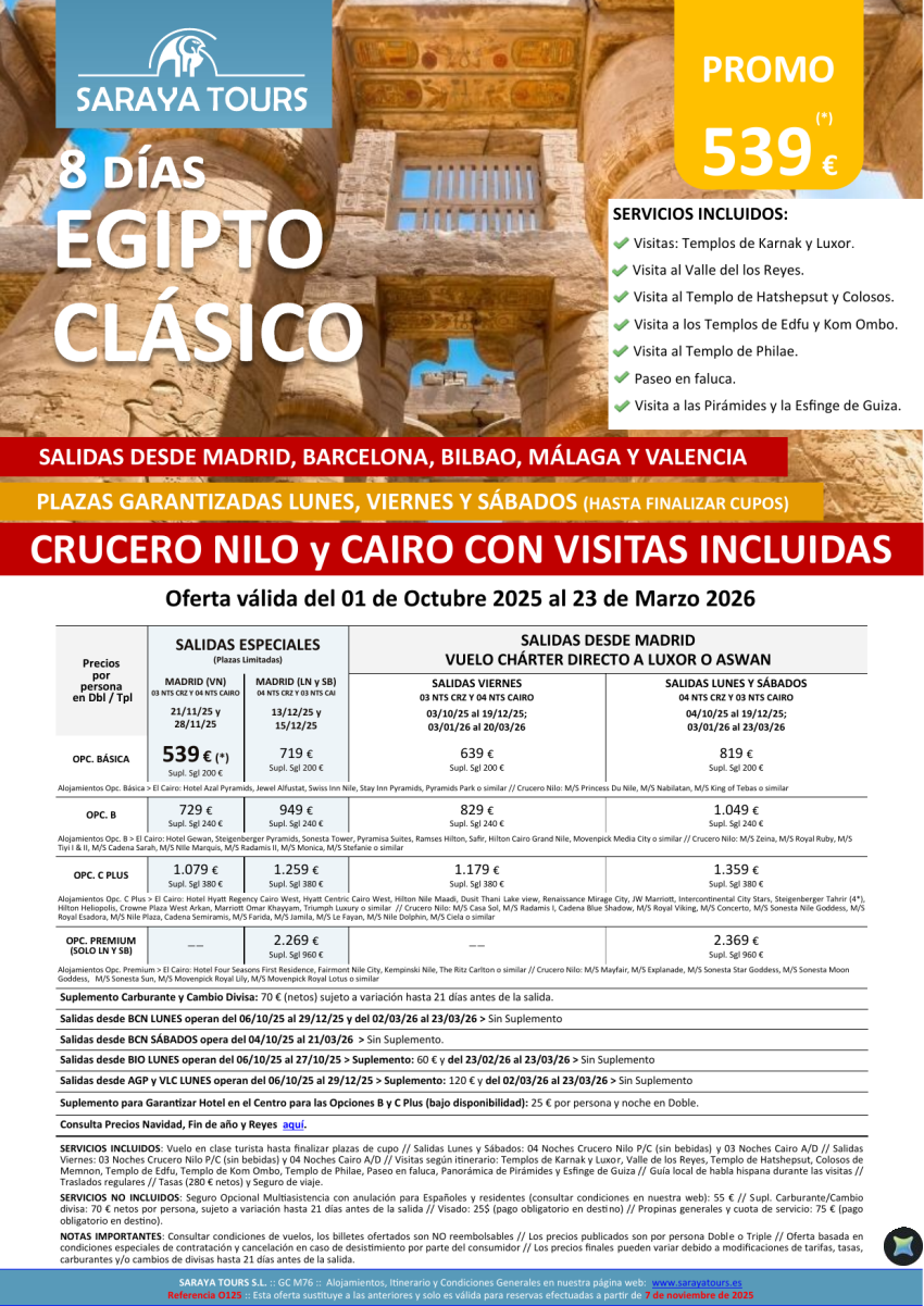 Egipto Clásico 8 días. *Salidas Bcn, Mad ,Agp ,Bio & Vlc * Crucero y Cairo + visitas dsd 499€ hasta Sept26